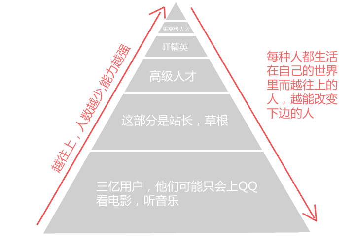 这个图里,我们可以很清楚的看到,虽然中国网民人数有5个亿,但是其中有3个亿是一些只会上QQ,看电影听歌的网民。另外其它的都是些草根站长,站长,产品经理,高端IT人才,黑客及隐士,IT科学家。他们各自生活在各自的世界里,而从下到上的这条路是越来越窄的,而正是因为少,所以那些高高在上的20%的人物才会决定着整个互联网的发展。